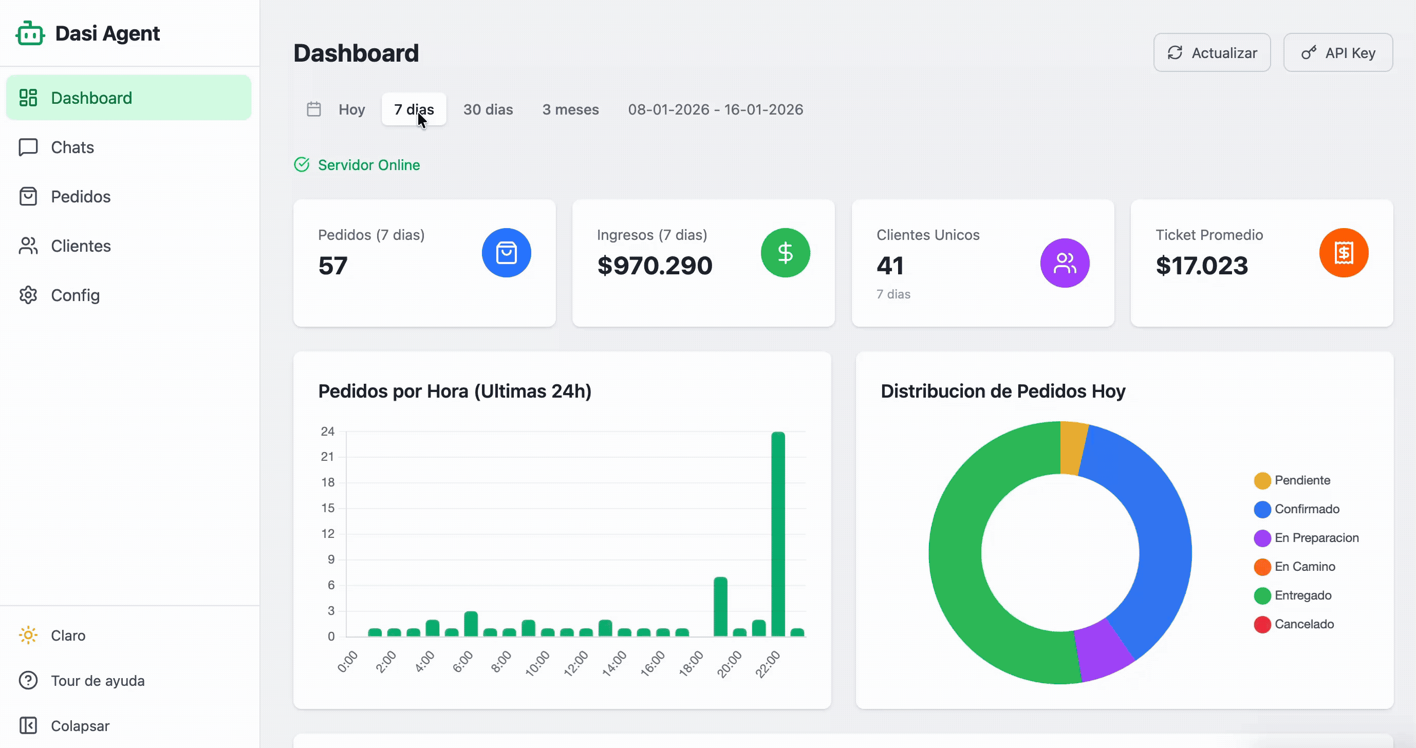 Dasi Agent es un asistente de IA que responde por WhatsApp. Toma pedidos, confirma citas, responde consultas. Adaptable a tu industria.